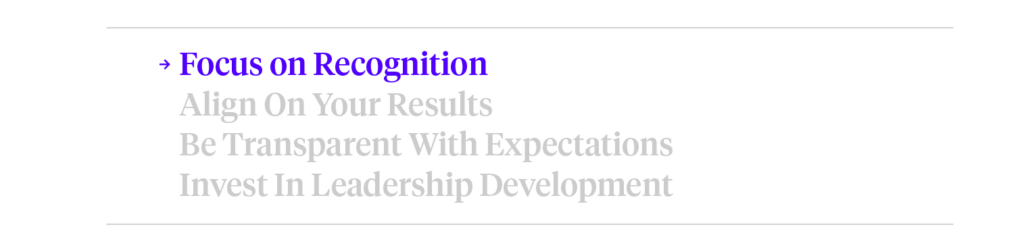Focused employee recognition is openly acknowledging and expressing appreciation for a person’s positive contributions to the organization. When there’s no focused recognition, it creates an experience that can lead to job dissatisfaction, because it’s human nature to want to feel valued and appreciated.